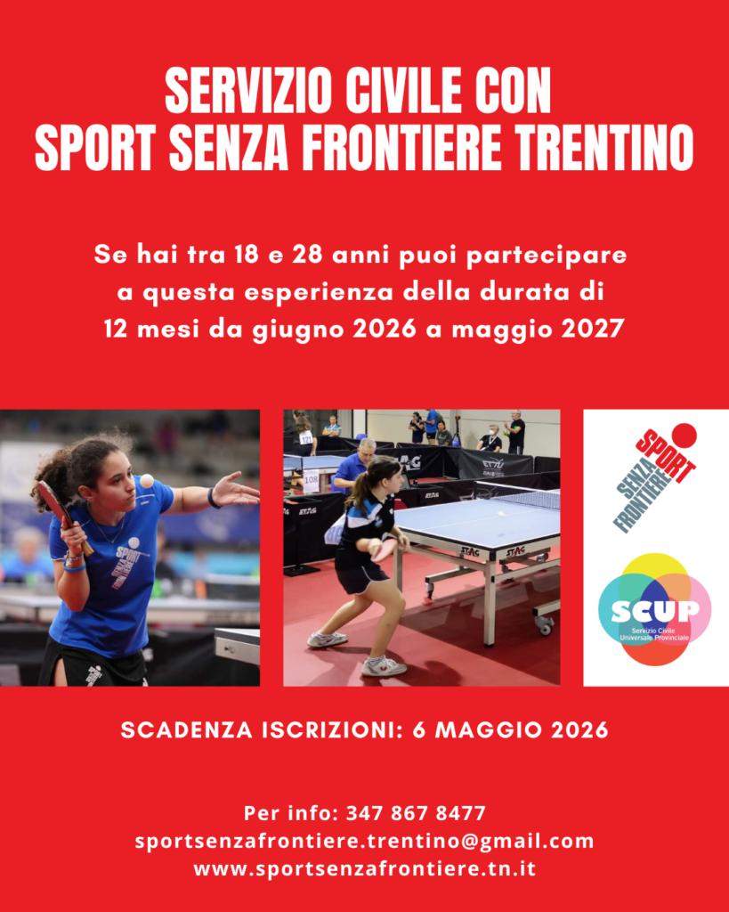 Si tratta di un progetto che vede capofila l’Associazione Sport Senza Frontiere Trentino APS ASD che ricerca un/una giovane da impiegare in attività socio-sportive per minori e famiglie rispetto alla disciplina del tennistavolo.